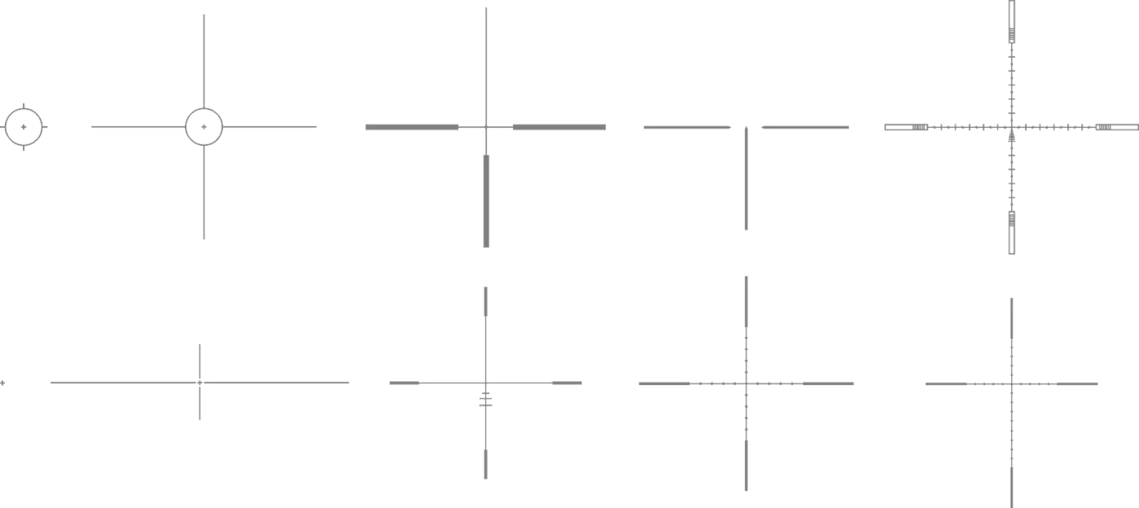 Široká škála farebne prispôsobiteľných zameriavacích krížov, vrátane škálovateľných balistických štýlov. Možnosti farieb: čierna, biela, červená a zelená.
